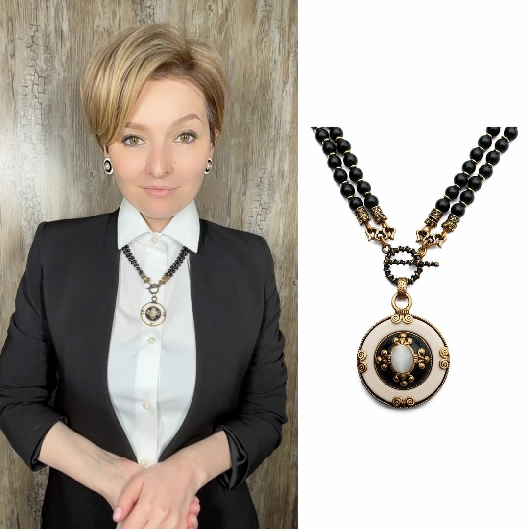 Колье в винтажном стиле На фото продавца колье синее, но в жизни это не так. Бусы черные, а вставка в кулон синяя Длина колье 96 см и 48 см в собранном состоянии